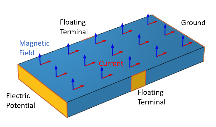 یک صفحه از مواد نیمه رسانا. جریان عبوری از ماده توسط میدان مغناطیسی منحرف می شود که پتانسیل الکتریکی بین دو پایانه شناور را تغییر می دهد.