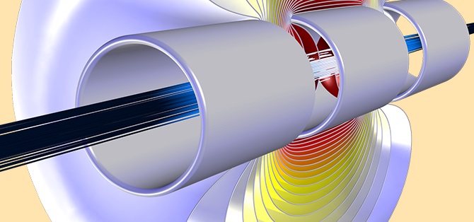 بیایید نگاهی به ناحیه اطراف الکترودها (در این مورد سیلندرها) که در آن پرتو متمرکز شده است بیاندازیم. در تصویر سمت چپ زیر، سطوح هم پتانسیلی را می بینیم که الکترودها را احاطه کرده اند. ما همچنین میتوانیم پتانسیل الکتریکی و میدانهای حاشیهای را با نگاه کردن به مقطع نزدیک الکترودها (در تصویر سمت راست زیر نشان داده شده) مطالعه کنیم. لنزهای Einzel برای متمرکز کردن پرتوهای ذرات باردار در لولههای پرتو کاتدی (CRTs) استفاده میشوند. برای آنالیز صحیح عدسی اینزل، باید ذرات باردار موجود در عدسی را در معرض تحریک الکتریکی مناسب مطالعه کنیم. در اینجا، یکی از این نمونه ها را مورد بحث قرار می دهیم که از ماژول ردیابی ذرات، محصولی افزودنی برای نرم افزار استفاده می کند. در مورد تجزیه و تحلیل جریان بتن در شفت های حفاری با کامسول CFD بخوانید.