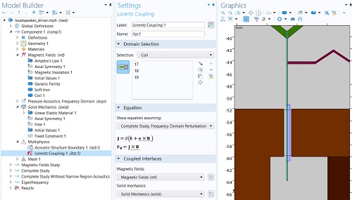 ویژگی Lorentz Coupling نیروی لورنتس و EMF پشتی را برای ثبت این اثر دو طرفه محاسبه می کند. این یک ویژگی کوپلینگ چندفیزیکی بین رابط میدان های مغناطیسی و رابط مکانیک جامد است که نیروی لورنتس را از رابط میدان های مغناطیسی به رابط مکانیک جامد منتقل می کند و میدان الکتریکی القایی را از رابط مکانیک جامد به رابط میدان های مغناطیسی منتقل می کند.